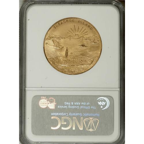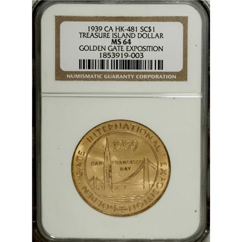 <B>1939 Golden Gate Exposition, Treasure Island Dollar MS64 NGC.</B></I> HK-481. San Francisco Bay and the new bridge are depicted on the obverse, while the reverse shows an airplane flying over "Treasure Island" in the foreground with the Golden Gate bridge in the background. These pieces were produced in gilt bronze, and this piece retains full color and luster.<BR><BR><b>Shipping:</b> Coins & Currency (<a target="_blank" href="http://www.heritageauctions.com/common/shipping.php">view shipping information</a>)