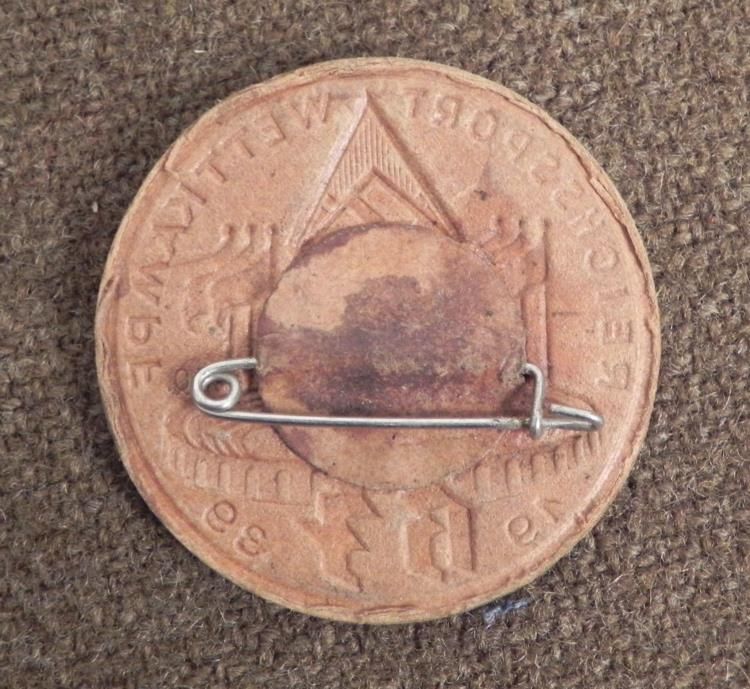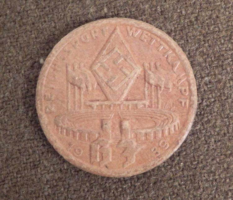 1939 HITLER YOUTH REICHSSPORT WETTKAMPF BADGE-RARE ORIGINAL 1 1/2" DIAMETER-COMPOSITE MATERIAL-PIN BACK-SHOWS HJ RALLEY STADIUM ON FRONT
