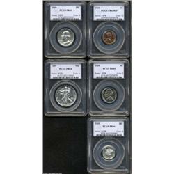 <table><tr><td><TABLE cellSpacing=0 cellPadding=0 width="100%" bgColor=#000000 border=0><TBODY> <TR><TD width="100%"><TABLE cellSpacing=1 cellPadding=3 width="100%" border=0><TBODY><TR><TD width="100%" bgColor=#79735c><FONT face=arial color=#ffffff size=3><B>Description</B> </FONT></TD></TR><TR><TD width="100%" bgColor=#ffffff><FONT face=arial size=2><B>A 1939 Proof Set PR63 to PR66 PCGS.</B></I> The set includes: <B>1939 Cent PR63 Red,</B></I> luminous pumpkin-orange color, a few toning flecks on the upper obverse; <B>1939 Reverse of 1938 Nickel PR64,</B></I> lovely gold and mauve hues with scattered minute carbon flecks; <B>1939 Dime PR66,</B></I> well struck, untoned, magnificently preserved; <B>1939 Quarter PR65,</B></I> Washington's cheek has a mint-made lintmark, essentially brilliant, a reasonable strike; and a <B>1939 Half Dollar PR64,</B></I> impressive for the grade, brilliant with hints of cameo contrast.<BR><I>From the Holman Family Collection.</B></I> (5 Coins) </FONT></TD></TR></TBODY></TABLE></TD></TR></TBODY></TABLE><BR><A name=PricesRealized></A><TABLE cellSpacing=0 cellPadding=0 width="100%" bgColor=#000000 border=0><TBODY><TR><TD width="100%"><TABLE cellSpacing=1 cellPadding=3 width="100%" border=0><TBODY><TR><TD width="100%" bgColor=#79735c><A name=PR><FONT face=arial color=#ffffff size=3><B>Previous Prices from Heritage Auctions</B> </FONT></A></TD></TR><TR><TD bgColor=#f6f6ed>No Prior Data Recorded </TD></TR><TR><TD bgColor=#ffffff><FONT face=arial size=1 ?>PLEASE NOTE: All prices realized reflect the final hammer price PLUS the buyer's premium in auctions that charge a buyer's premium. Each item has a notation at the top of the listing indicating whether that lot included a buyer's premium. Example: A item that sells with a final hammer price of $100 and a 20% buyer's premium will display with a price realized of $120. All information listed is intended to be as accurate as possible, but errors are possible. Please use this guide carefully and inform us of any inaccuracies. </FONT></TD></TR></TBODY></TABLE></TD></TR></TBODY></TABLE><BR><TABLE cellSpacing=0 cellPadding=0 width="100%" bgColor=#000000 border=0><TBODY><TR><TD width="100%"><TABLE cellSpacing=1 cellPadding=3 width="100%" border=0><TBODY><TR><TD width="100%" bgColor=#79735c colSpan=6><FONT face=arial color=#ffffff size=3><B>Price Guide*</B> </FONT></TD></TR><TR bgColor=#f6f6ed><TD align=middle><B>Grade</B> </TD><TD align=middle><B>Coin World<BR>(Trends)</B> </TD><TD align=middle><B>Numismedia<BR>Retail</B> </TD><TD align=middle><B>Numismedia<BR>Wholesale</B> </TD><TD align=middle><B>Coin<BR>Universe</B> </TD><TD align=middle><B>Heritage<BR>Value Index</B> </TD></TR><TR><TD colSpan=6>No Pricing Data Available</TD></TR><TR bgColor=#ffffff><TD colSpan=6><FONT size=1>*All information listed is intended to be as accurate as possible, but errors are possible. No item may be returned or refused based on this information which is provided as a service to our customers. You should contact each pricing source directly to determine the accuracy of this information. </FONT></TD></TR></TBODY></TABLE></TD></TR></TBODY></TABLE><BR><TABLE cellSpacing=0 cellPadding=0 width="100%" bgColor=#000000 border=0><TBODY><TR><TD width="100%"><TABLE cellSpacing=1 cellPadding=3 width="100%" border=0><TBODY><TR><TD width="100%" bgColor=#79735c><FONT face=arial color=#ffffff size=3><B>Population Guide</B> </FONT></TD></TR><TR bgColor=#ffffff><TD align=middle></TD></TR></TBODY></TABLE></TD></TR></TBODY></TABLE><BR><TABLE cellSpacing=0 cellPadding=0 width="100%" bgColor=#000000 border=0><TBODY><TR> 5 Coins Important notice: Heritage usually auctions material at the rate of 200-250 lots per hour. On some occasions eBay Live bid software or the Internet may not be able to keep up with the pace of the auction. We recommend placing a realistic absentee bid now as insurance to avoid disappointment. Occasionally the auctioneer may eliminate or reject an eBay Live bid, and the auctioneer may also reopen a lot after the close of the eBay live bidding (usually because we missed an audience bid), and may reject your bid even if it shows you as the winning bidder. By bidding via eBay Live, you agree that Heritage may award the lot to another bidder at its sole discretion under the circumstances described above or any other reasonable circumstances. Also please note that all Heritage lots purchased through eBay Live carry a 20% Buyer's Premium. Please make sure you read the Terms and Conditions before you bid.</TD></TR></TBODY></TABLE></TD></TR></TBODY></TABLE>