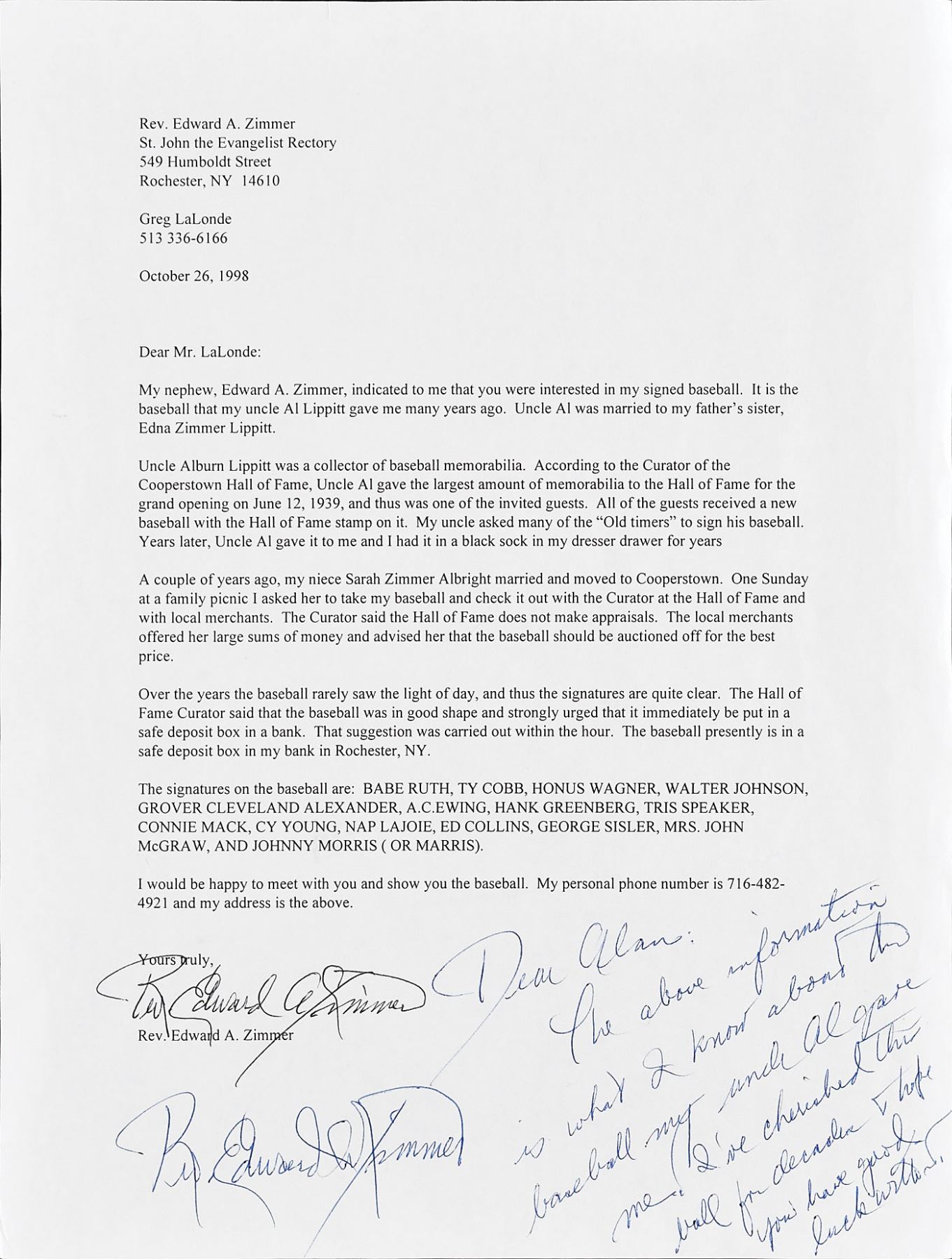In 1939, Alburn Lippitt, "who was a devoted baseball memorabilia collector" (according to the Rochester Newspaper front page story) attended the opening induction ceremonies at the Hall of Fame in Cooperstown. Mr. Lippitt had donated a significant amount of baseball memorabilia for the grand opening, "including a mid-1860s Baraboo, Wisconsin full uniform" - one of the oldest uniforms ever seen to date! As such, he was invited to be an honored guest at the festivities and the Hall of Fame presented him with a completely signed "Hall of Fame" baseball. Then, in 1947, for his nephew Edward Zimmer's ordination as a priest, Mr. Lippitt presented Edward this ball as a gift. Until 1999, Reverend Zimmer kept the ball in his sock drawer for safe keeping knowing that it was not only a special piece of sports history but also of sentimental value from his Ordination Day.