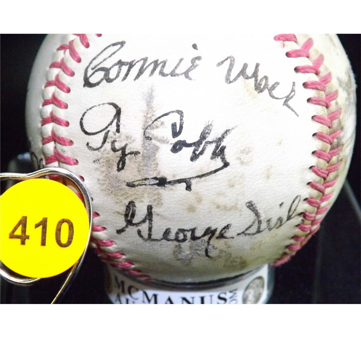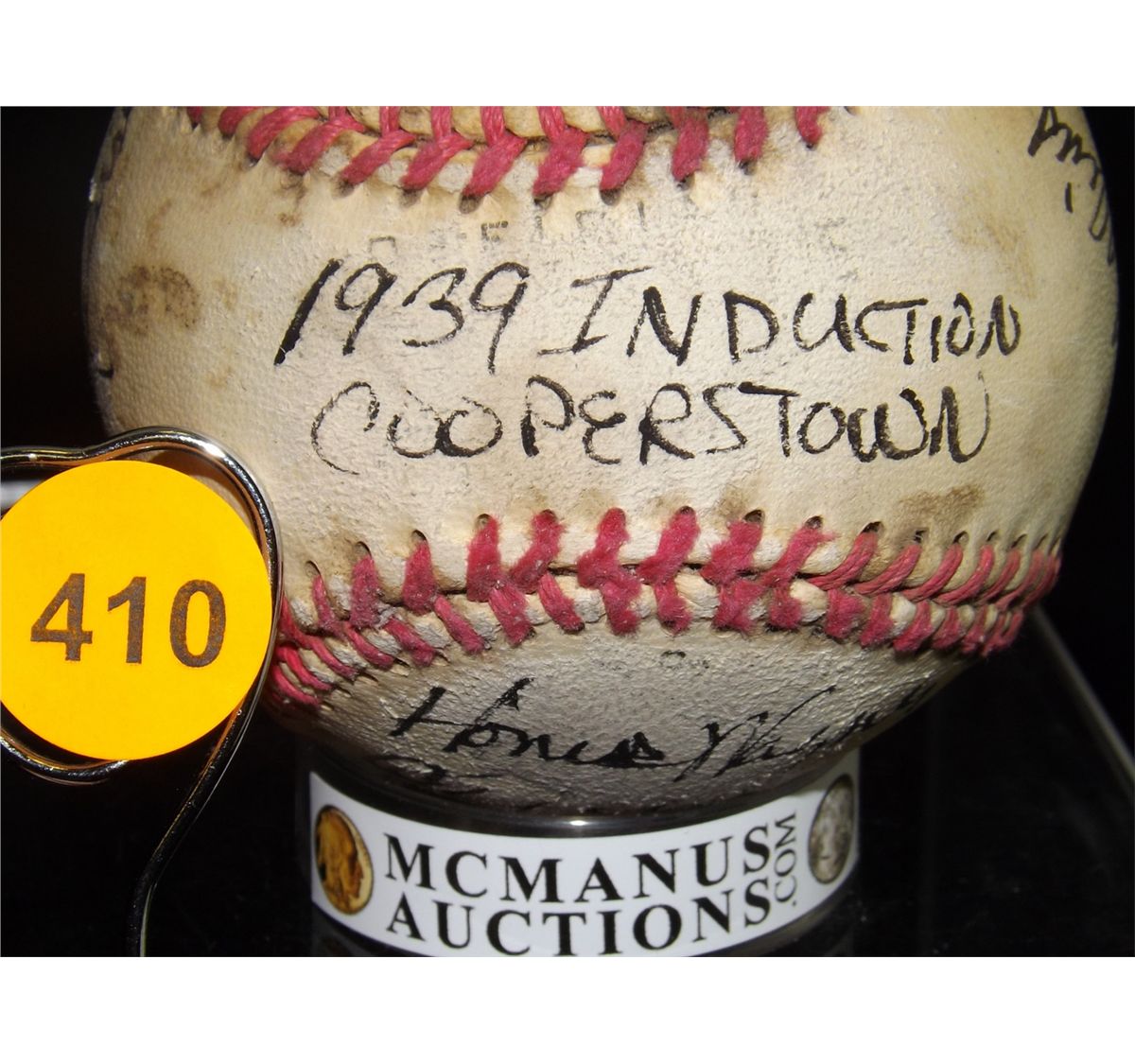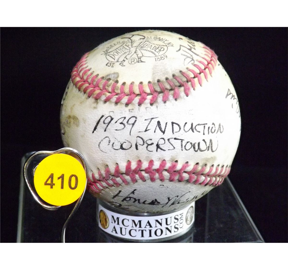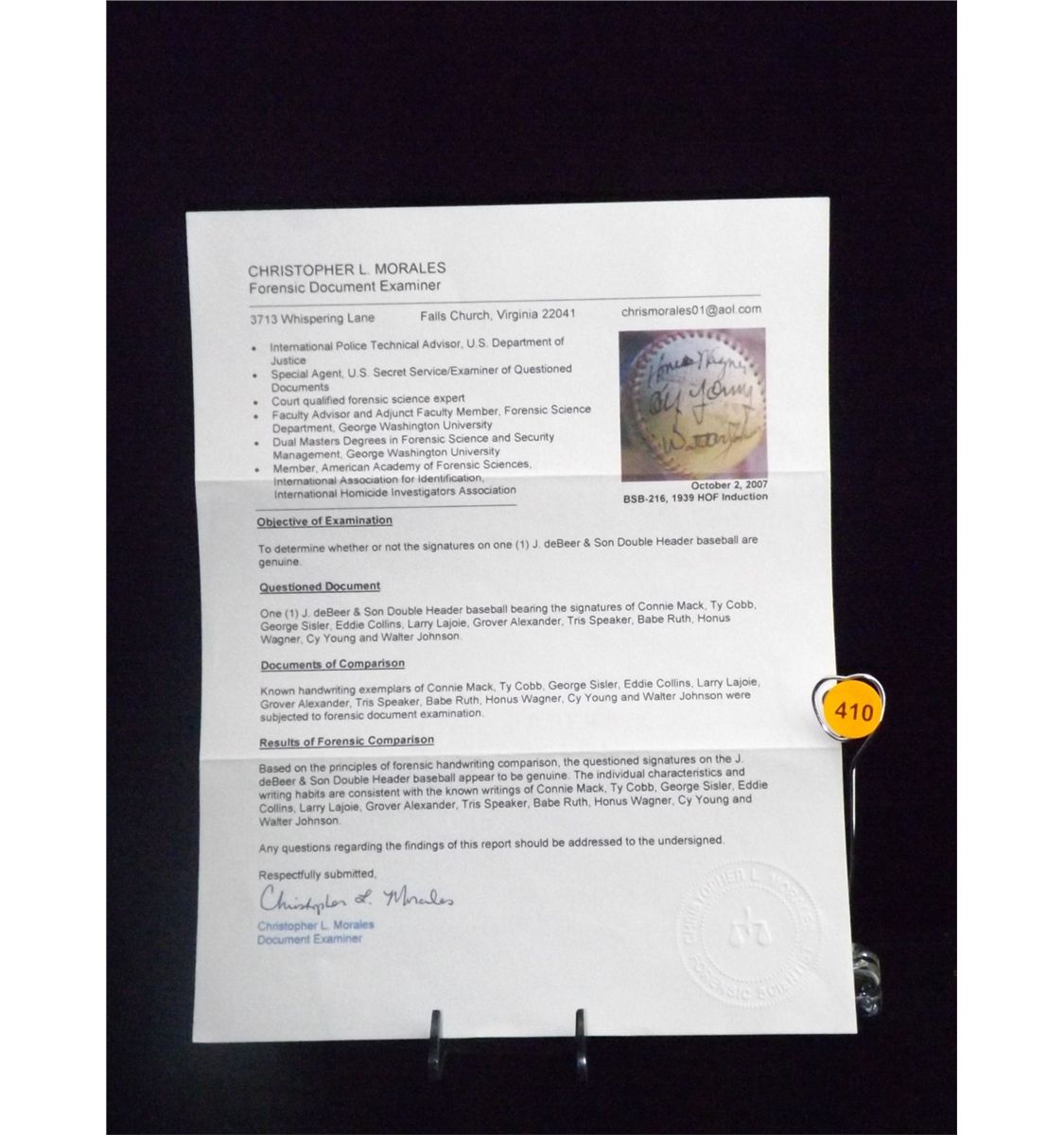 1939 Hall of Fame Induction Cooperstown Autographed Baseball. J. deBeer and Sons Double Header Ball Autographed by: Connie Mack, Ty Cobb, George Sisler, Eddie Collins, Larry Lajoie, Grover Alexander, Tris Speaker, Babe Ruth, Honus Wagner, Cy Young and Walter Johnson. Appraised or estimated retail value $175,000. COA by Christopher Morales. All Sales Final. Please see terms and conditions of auction.
