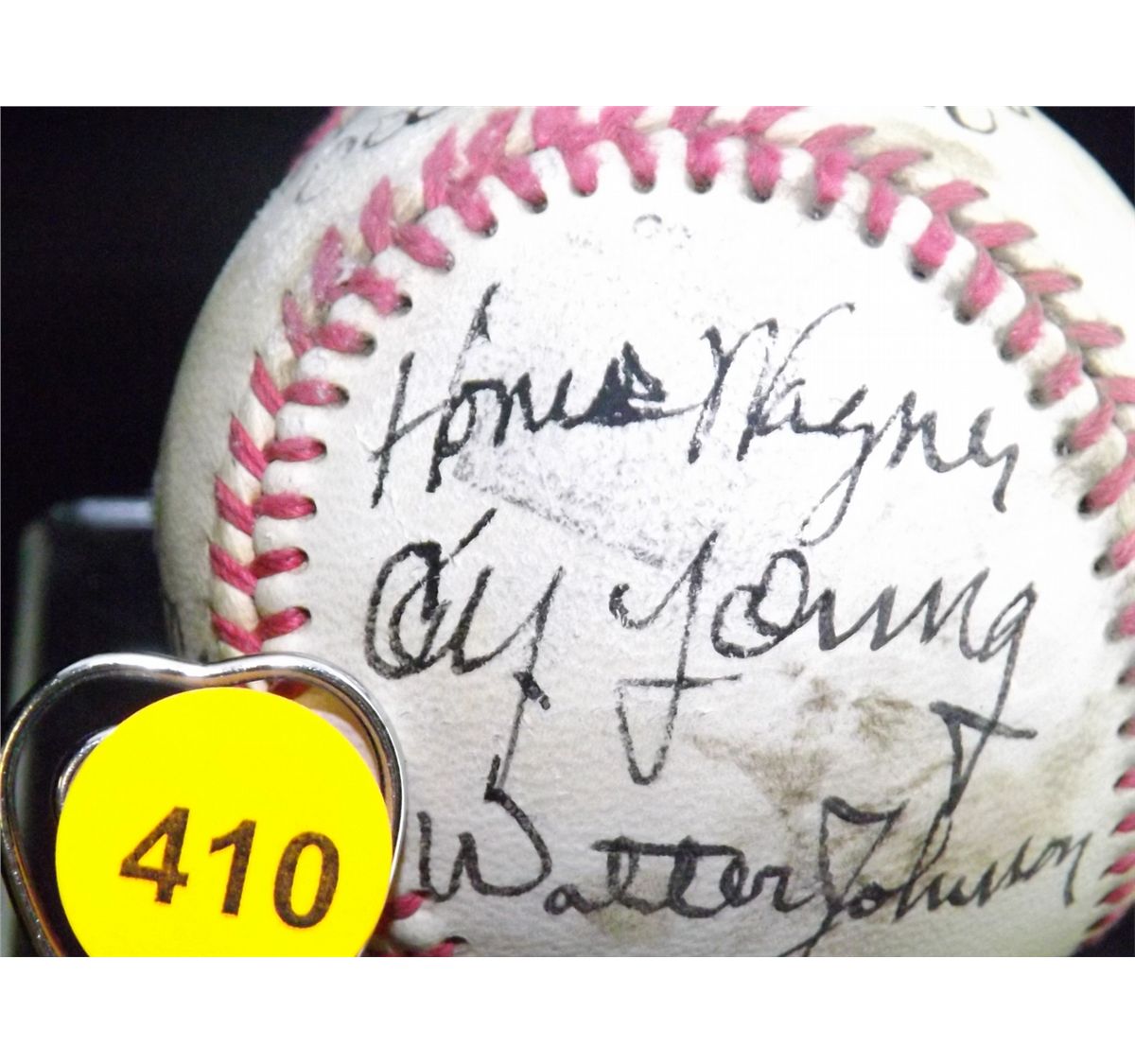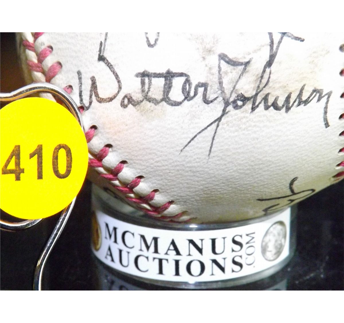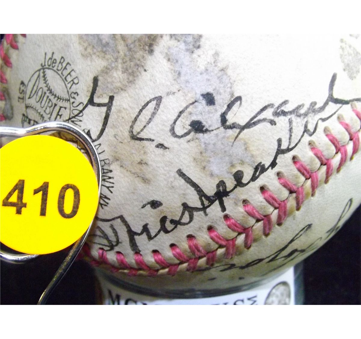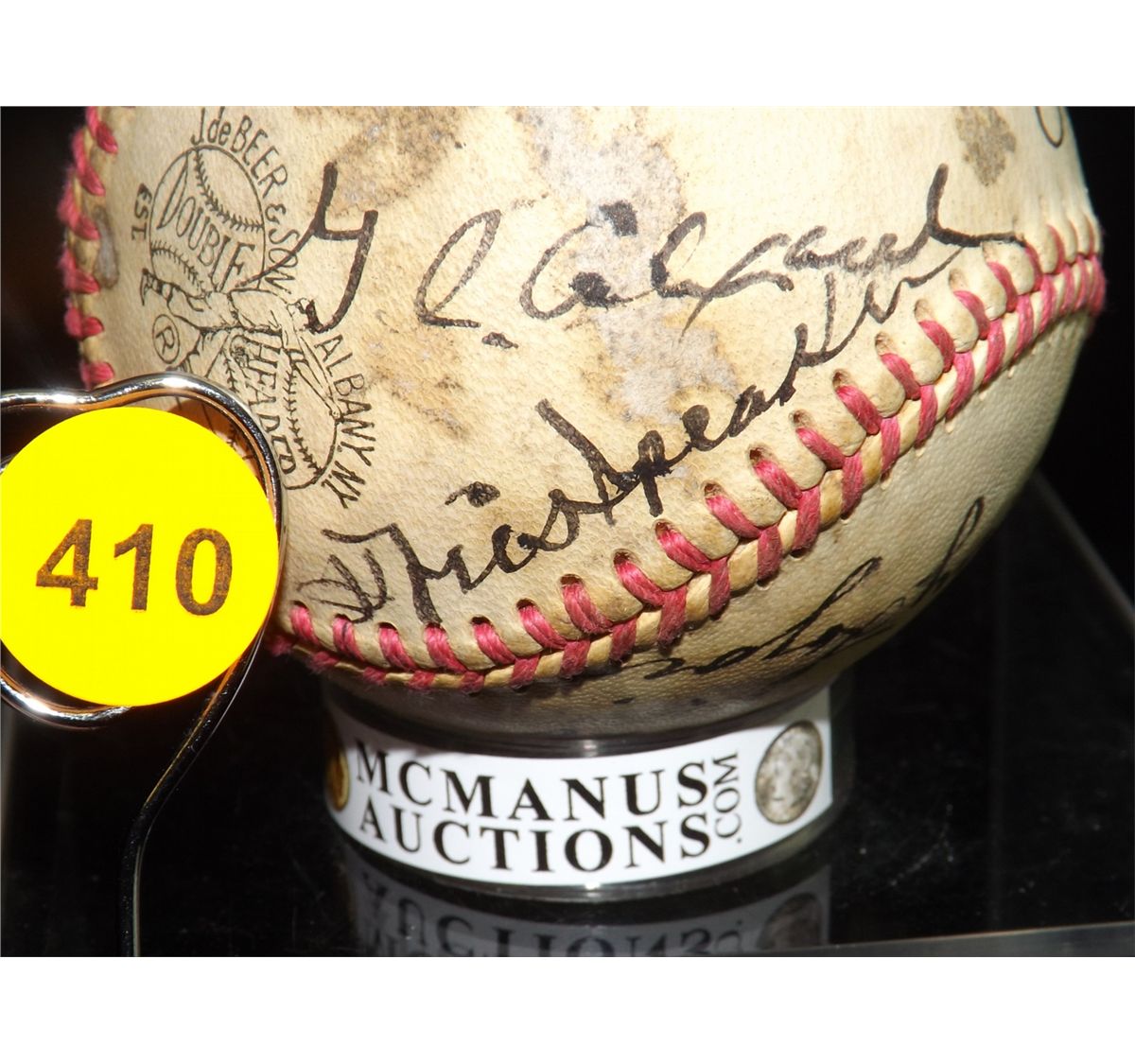1939 Hall of Fame Induction Cooperstown Autographed Baseball. J. deBeer and Sons Double Header Ball Autographed by: Connie Mack, Ty Cobb, George Sisler, Eddie Collins, Larry Lajoie, Grover Alexander, Tris Speaker, Babe Ruth, Honus Wagner, Cy Young and Walter Johnson. Appraised or estimated retail value $175,000. COA by Christopher Morales. All Sales Final. Please see terms and conditions of auction.