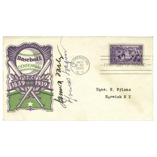 <B>1939 Honus Wagner Signed Hall of Fame First Day Cover.</B></I> Marvelous 10/10 blue ink signature from the great Pittsburgh Pirates shortstop and coverboy for the hobby's most coveted trading card is made all the more appealing by the fact that it dates to the Opening Day of the Hall of Fame. We are assured of this fact not only by the Cooperstown, NY postmark of June 12, 1939, but also by the signature of James Farley that joins Wagner's. Farley was Postmaster General under President Franklin Roosevelt, and was on hand at the Hall of Fame inauguration to debut the stamp that appears at upper right. The glue that was used to manufacture the envelope has toned slightly, but this does not encroach upon the autographs, nor does it diminish the fine appearance of the otherwise pristine mailer. <I>LOA from PSA/DNA.</B></I>