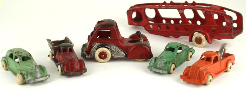 1939 Hubley cast iron Auto Transport, 10" long, includes 2 cast iron cars, stake bed truck and tow truck , all part of the load and approx. 3 1/2" long. All show original paint and very good condition. Est. 275-375
