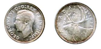 1939. ICCS Mint State-64. A brilliant and frosty twenty-five cents piece. (This example with an error insert/flip. ICCS has called the coins a 24 CENTS piece!!).