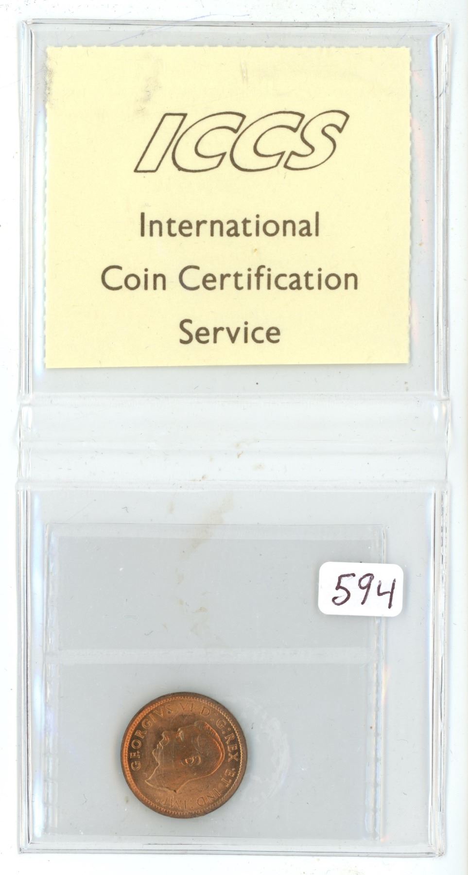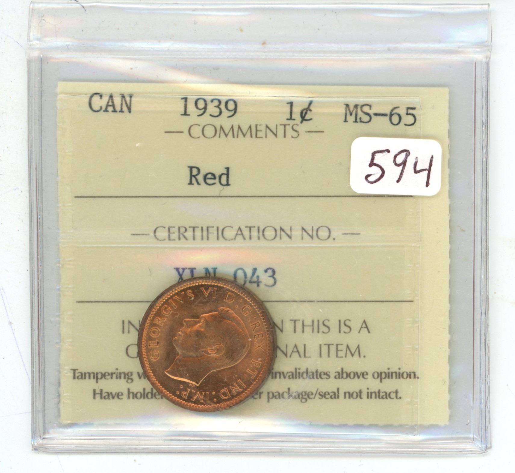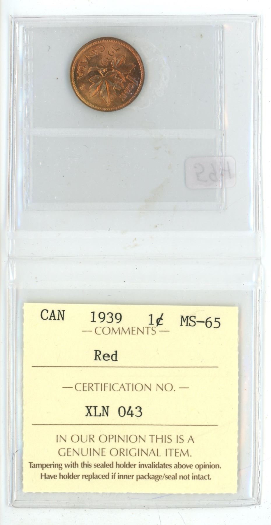 1939 ICCS graded, Canadian red 1 cent penny coin - MS65
