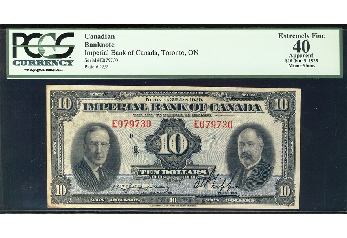 1939 Imperial Bank of Canada; 1 Dollars, 0 #E079730 CH-375-24-04 PCGS EF40 Apparent. Minor stains.
