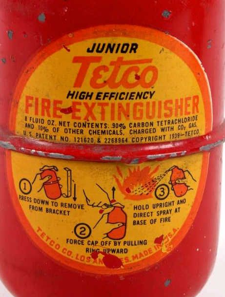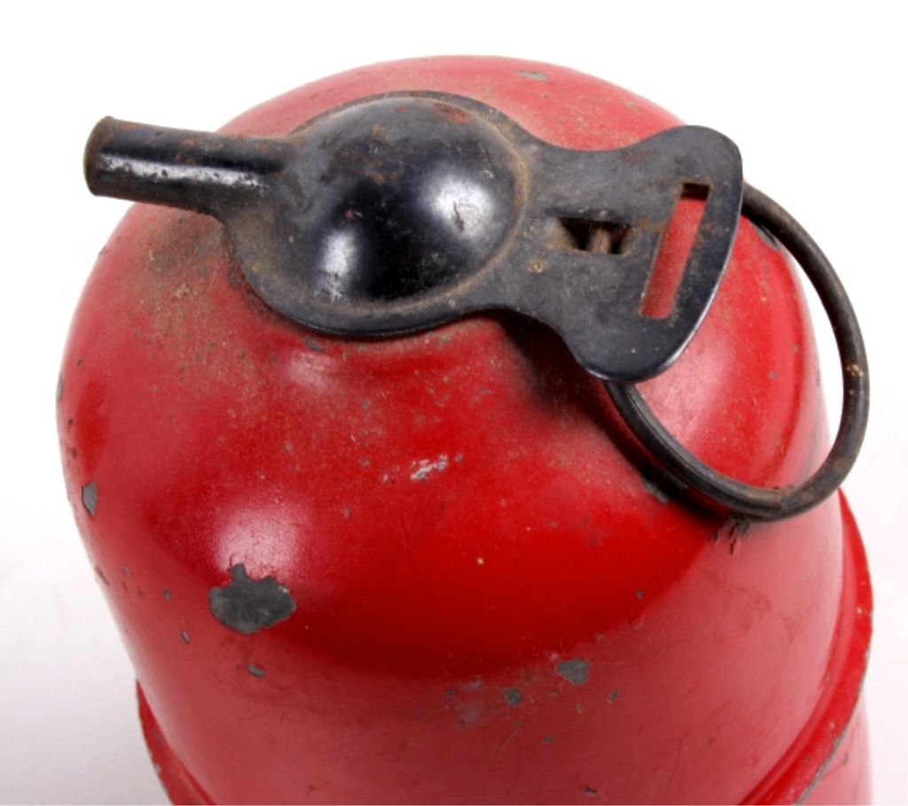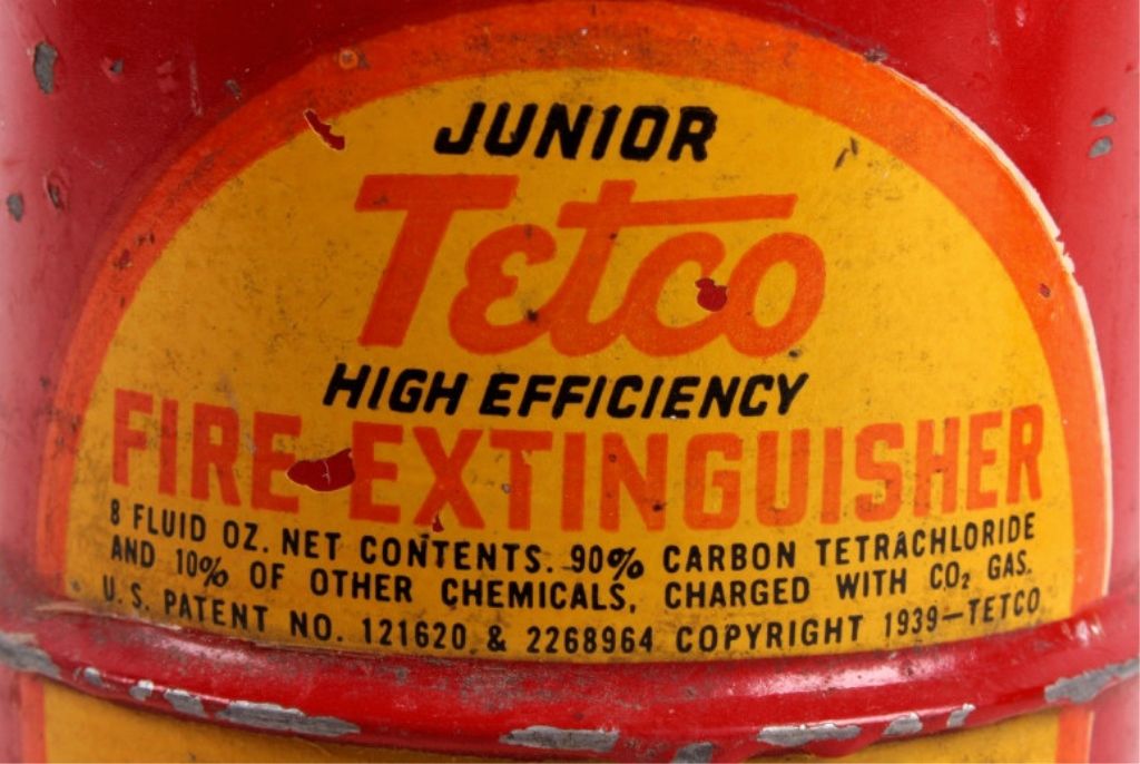 This is an original handheld fire extinguisher made by Tetco in 1939. The lot features two of the extinguishers for one money. These have not been used and still have the pin. Each measures 4.5"x3"