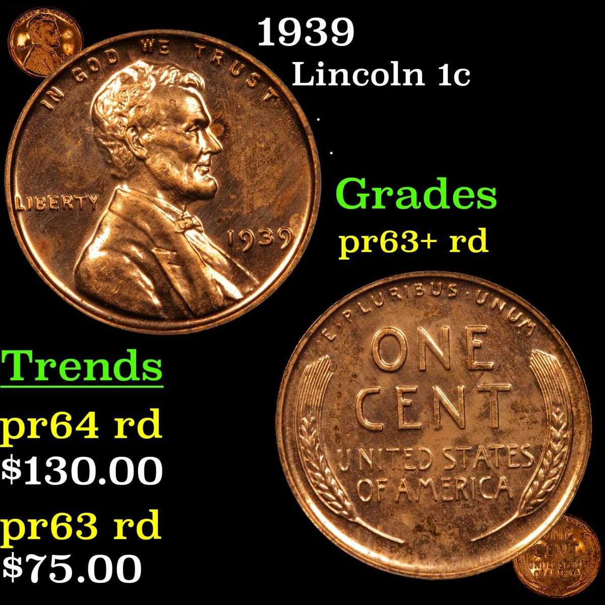 1939 Lincoln Cent 1c Grades Select+ Proof Red.