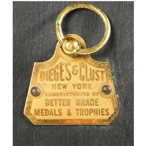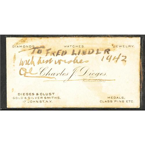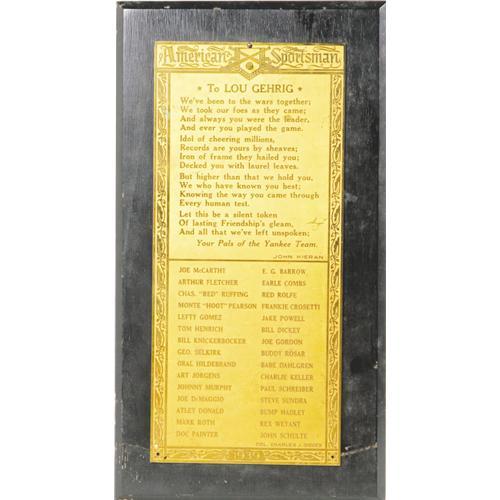 <B>1939 Lou Gehrig Retirement Presentational Plaque.</B></I> The most heartbreaking and inspiring moment in baseball history came on July 4, 1939, when the heroic Iron Horse bade farewell to his fans with the unforgettable words, "Today I consider myself the luckiest man on the face of the earth." One of the many gifts bestowed upon the departing legend was a silver charger engraved with a poem entitled "American Sportsman," and the names of all of his Yankees teammates. As a special gift to a select group of VIP's, the famed makers Dieges & Clust fabricated a small supply of plaques bearing the same text. This one was presented to Gehrig's close friend and Treasurer of the New York Yankees Frank Linder a few years after that sad Independence Day. A short note on Col. Charles J Dieges' business card, affixed to verso, dedicates it to Linder. The plaque measures 7x13" in size and shows light wear from decades of storage, but nothing that can diminish the tremendous visual and historical appeal. Only those closest to this monumentally important figure owned one of these touching memorials. Will you join that elite group with a winning bid? Letter of provenance from Linder's grandson is included.