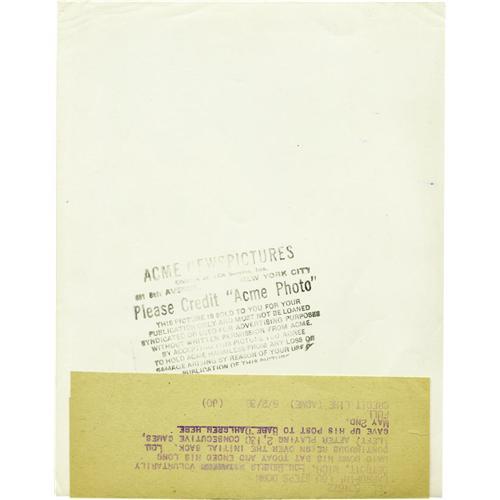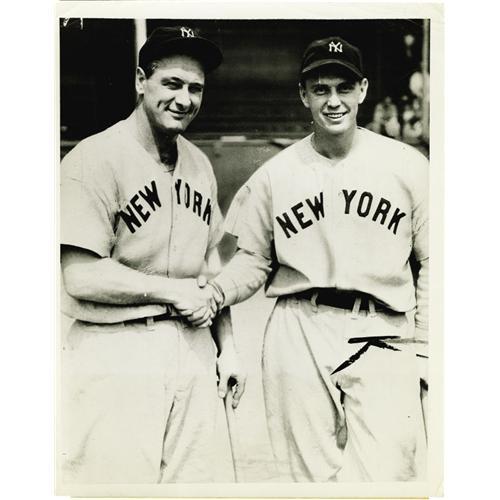 <B>1939 Lou Gehrig's Streak Ends Wire Photograph.</B></I> Heartbreaking image pictures the Iron Horse putting on a brave face as he turns over first base duties to young Babe Dahlgren. Paper caption on verso reads, "Larrupin' Lou Steps Down. Detroit, Mich. Lou Gehrig voluntarily laid down his bat today and ended his long continuous reign over the initial sack. Lou (Left) after playing 2,130 consecutive games, gave up his post to Babe Dahlgren here May 2nd, Full Credit Line (Acme) 5/2/39." Monumentally important photo has insignificant editor's ink marks on Dahlgren's pants, but otherwise presents as NRMT. Measures 7x9" in size. <BR><BR><B>Important notice:</B> Heritage usually auctions material at the rate of 200-250 lots per hour. On some occasions eBay Live bid software or the Internet may not be able to keep up with the pace of the auction. We recommend placing a realistic absentee bid now as insurance to avoid disappointment. Occasionally the auctioneer may eliminate or reject an eBay Live bid, and the auctioneer may also reopen a lot after the close of the eBay live bidding (usually because we missed an audience bid), and may reject your bid even if it shows you as the winning bidder. By bidding via eBay Live, you agree that Heritage may award the lot to another bidder at its sole discretion under the circumstances described above or any other reasonable circumstances. Since eBay bids are not shown to us until we open the lot on the floor, we treat those bids just like floor bids. In most cases the floor responds before the eBay bid is presented to us, due to Internet lag time, so for consistency we have made it a policy that floor bids are always considered first over tie eBay live bids. Also please note that all Heritage lots purchased through eBay Live carry a 22.5% Buyer's Premium. Please make sure you read the Terms and Conditions before you bid. This lot is being auctioned in conjunction with a live floor auction by Heritage Galleries & Auctioneers. All final auction and invoice information will be supplied by Heritage Galleries & Auctioneers, and all other information should be considered preliminary. Lot:19455 <BR><BR><B>Winning Notification and Billing:</B> After the FINAL session in this auction is complete, Heritage will send e-mail and snail mail invoices. This process normally takes several days. All final auction and invoice information will be supplied by Heritage Galleries & Auctioneers, and all other information should be considered preliminary. <BR><BR>This auction will be conducted on a live auction floor and over the Internet through eBay Live. If you choose to place an absentee bid, please take a moment to <font color='#0000ff'><u><a href='http://pages.ebay.com/liveauctions/help/before/laabsentee.html'>learn how eBay Live absentee bidding works</a></u></font><font color='#000000'>