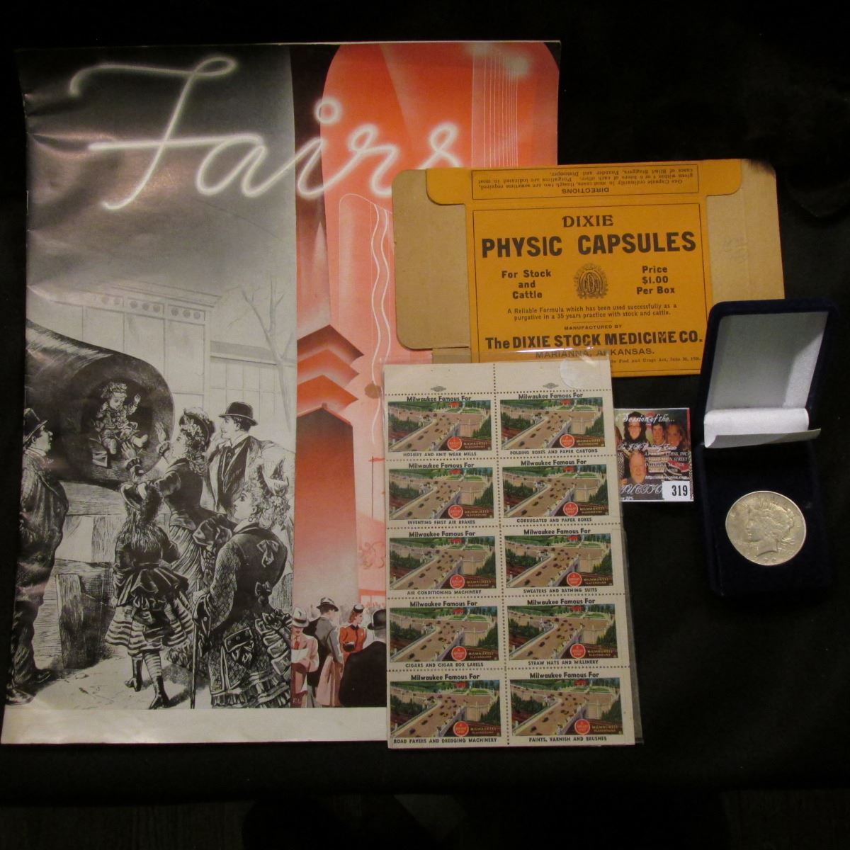 "1939 New York - World Fair" Original issue of "Travelers" with articles such as "Fairs Past & Present", "Commemorative Stamps", "Golden Gate Exposition", and etc.; sheet of 10 "Milwaukee Fanous For…: Stamps; original unfolded box "Dixie Physic Capsules...The Dixie Stock Medicine Co. Marianna, Arkansas"; & a felt box with a 1922 U.S. Peace Dollar, Fine.