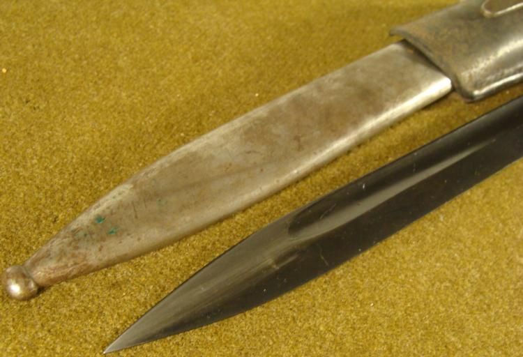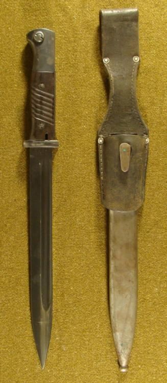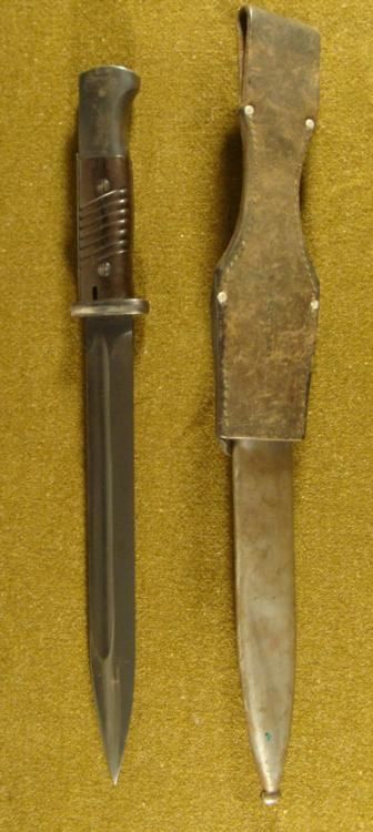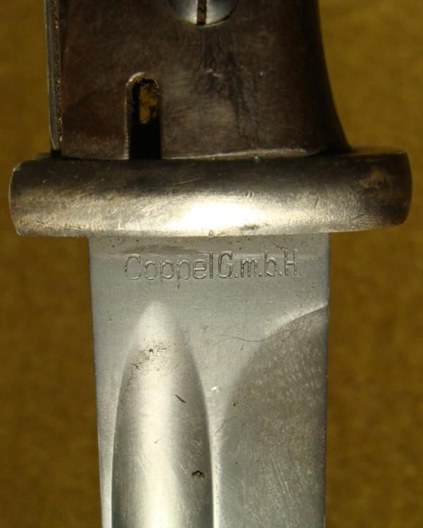 OFFERED HERE IS AN ORIGINAL 1939 NAZI FIELD COMBAT BAYONET & LEATHER FROG. THERE ARE BAKELITE GRIPS ON THE BAYONET AND BLUED POMMEL WITH WAFFENAMT-THE RELEASE BUTTON WORKS FINE. IT HAS AN OUTSTANDING BLUED BLADE WITH NO DINGS OR SHARPENING THAT IS 98% ORIGINAL BLUEING. THE RICASSO IS MARKED "COPPEL GMBH" WITH A REVERSE SERIAL #5094C. THE SPINE IS DATED 1939. THE STEEL SCABBARDS HAS THE SERIAL #6469 AND MAKER'S MARK ASW42. THE BAYONET HAS A ORIGINAL TO ITEM LEATHER FROG WITH A SEAM ON ONE SIDE THAT IS INTACT BUT HAS SEPARATION. *