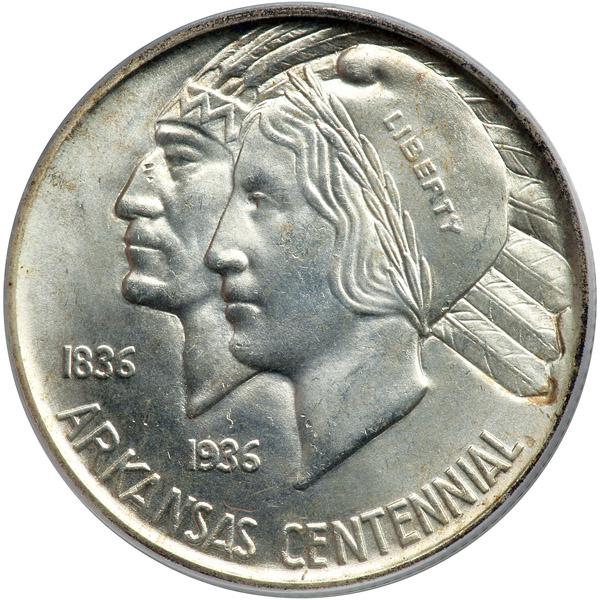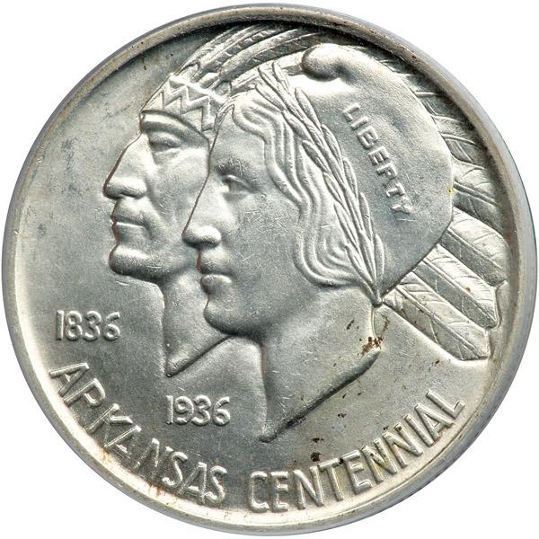Struck to commemorate the 100th anniversary of the admission of Arkansas to the Union, June 15, 1836. Two Art Deco heads are Liberty and (evidently) a Quapaw Indian, the tribe that inhabited what would become the Territory of Arkansaw. Edward Everett Burr designed the piece along with the help of several others.
