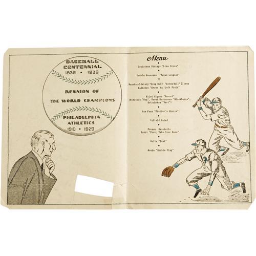 <B>1939 Philadelphia Athletics Championship Teams Reunion Signed Menu.</B></I> Connie Mack's World Series-winning squads of the twentieth century's first three decades convened on September 10, 1939 to relive past glories, and to place their autographs on this rare keepsake. Forty autographs are here in all, featuring some of the biggest stars of the era: J. Franklin Baker, Herb Pennock (twice), Mickey Cochrane, Eddie Collins, Chief Bender, William Harridge, Joe Bush, Max Bishop, Stuffy McInnis, Cy Perkins and many more. One autograph has been clipped from the menu at lower left-we assume it was Connie Mack himself. This area was repaired by tape ages ago, and the edges of the program show expected wear, but the autographs present remain in uniform 9/10 and better condition. A fine memento of what must have been an incredible night of reminiscing and story telling. <I>LOA from PSA/DNA.</B></I>