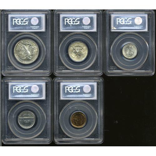 <B>1939 Proof Set PR66 to PR67 PCGS.</B></I> The set includes: <B>cent PR66 Red,</B></I> nicely detailed with vivid orange-red surfaces; <B>nickel PR66,</B></I> moderately reflective with faint gold patina; <B>dime PR67,</B></I> largely untoned with small spots of brick-red on the obverse; <B>quarter PR67,</B></I> hazy blue-violet, gold, and green toning; and <B>half PR66,</B></I> milky pale-green patina over the obverse, reverse moderately mirrored.
