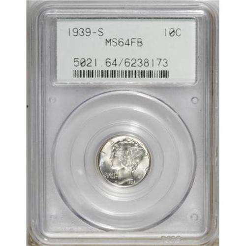 <B>1939-S 10C MS64 Full Bands PCGS.</B></I> PCGS Population (112/239). NGC Census: (14/48). Mintage: 10,540,000. Numismedia Wsl. Price for NGC/PCGS coin in MS64: $154. (#5021)<BR><BR><B>Coin Engraver:</B> Adolph A. Weinman<BR><BR><b>Shipping:</b> Coins & Currency (<a target="_blank" href="http://www.heritageauctions.com/common/shipping.php">view shipping information</a>)