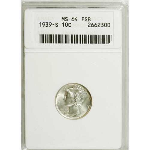 <B>1939-S 10C MS64 Full Bands ANACS.</B></I> NGC Census: (14/48). PCGS Population (112/234). Mintage: 10,540,000. Numismedia Wsl. Price: $154. (#5021)<BR><BR><b>Shipping:</b> Coins & Currency (<a target="_blank" href="http://www.heritageauctions.com/common/shipping.php">view shipping information</a>)