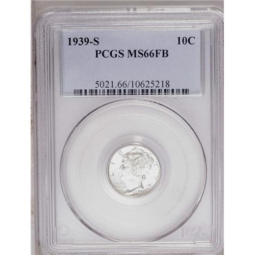 <B>1939-S<10C> MS66 Full Bands PCGS.</B></I> Subtle gold-tan and powder-blue color adheres to highly lustrous surfaces. The sharpness in strike transcends the Full Bands, as no areas reveal signs of significant weakness. A couple of light marks are visible on Mercury's cheek and hair near the ear, and on the lower fasces. Population: 86 in 66, 25 finer (5/06).