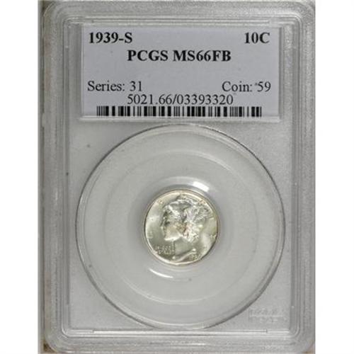 <B>1939-S 10C MS66 Full Bands PCGS.</B></I> A lustrous and meticulously struck Premium Gem with nearly unabraded fields. Dashes of gold toning adorn the peripheries. The reverse is moderately prooflike.<BR><BR><b>Shipping:</b> Coins & Currency (<a target="_blank" href="http://www.heritageauctions.com/common/shipping.php">view shipping information</a>)