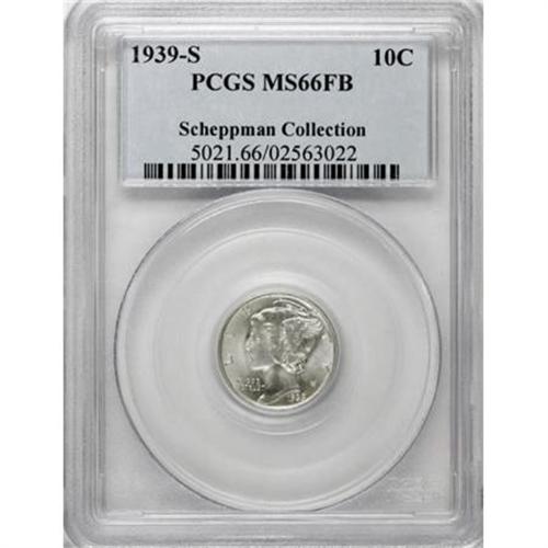 <B>1939-S 10C MS66 Full Bands PCGS.</B></I> Delicate gold, rose, and silver-blue tints visit the shining surfaces of this solidly struck San Francisco dime. Carefully preserved with elegant eye appeal. PCGS has graded 30 finer Full Bands examples (12/07).<BR><I>From The Scheppman Collection, #4 PCGS Registry of Full Band Mercury Dimes.</B></I><BR><BR><B>Coin Engraver:</B> Adolph A. Weinman<BR><BR><b>Shipping:</b> Coins & Currency (<a target="_blank" href="http://www.heritageauctions.com/common/shipping.php">view shipping information</a>)