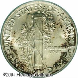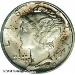 1939-S 10C MS67 Full Bands PCGS. A scarce, semi-ke <B>1939-S 10C MS67 Full Bands PCGS.</B></I> A scarce, semi-key issue among later date Dimes, only 10.5 million pieces were struck and a relatively small percentage of those exist today with Full Bands definition. This is a flashy, nearly perfect coin whose surfaces glow with a radiant, satiny luster beneath a smattering of mottled deep patina. Population: 23 in 67, 1 finer (10/04). <BR><BR><B>Important notice:</B> Heritage usually auctions material at the rate of 200-250 lots per hour. On some occasions eBay Live bid software or the Internet may not be able to keep up with the pace of the auction. We recommend placing a realistic absentee bid now as insurance to avoid disappointment. Occasionally the auctioneer may eliminate or reject an eBay Live bid, and the auctioneer may also reopen a lot after the close of the eBay live bidding (usually because we missed an audience bid), and may reject your bid even if it shows you as the winning bidder. By bidding via eBay Live, you agree that Heritage may award the lot to another bidder at its sole discretion under the circumstances described above or any other reasonable circumstances. Since eBay bids are not shown to us until we open the lot on the floor, we treat those bids just like floor bids. In most cases the floor responds before the eBay bid is presented to us, due to Internet lag time, so for consistency we have made it a policy that floor bids are always considered first over tie eBay live bids. Also please note that all Heritage lots purchased through eBay Live carry a 20% Buyer's Premium. Please make sure you read the Terms and Conditions before you bid. This lot is being auctioned in conjunction with a live floor auction by Heritage Galleries & Auctioneers. All final auction and invoice information will be supplied by Heritage Galleries & Auctioneers, and all other information should be considered preliminary. Lot:5828
