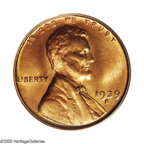 1939-S 1C MS67 Red PCGS. Blended orange-gold and lime 1939-S[1C] MS67 Red PCGS.