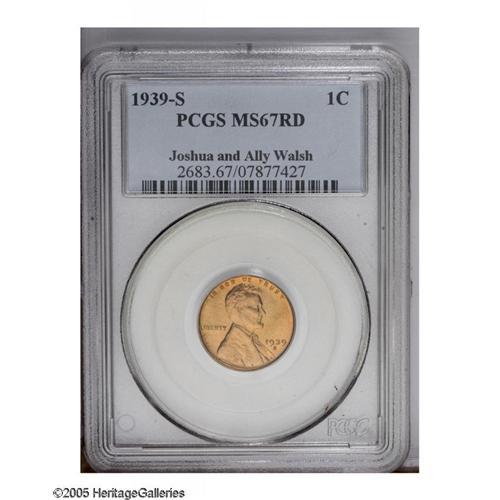 <B>1939-S<1C> MS67 Red PCGS.</B></I> Blended orange-gold and lime tints endow this lustrous and gorgeously preserved Superb Gem. The O in ONE is not completely brought up by the dies, but the strike is generally crisp. Neither PCGS nor NGC have certified any pieces above the MS67 Red level.<BR><I>From The Joshua and Ally Walsh Collection of United States Cents.</B></I>