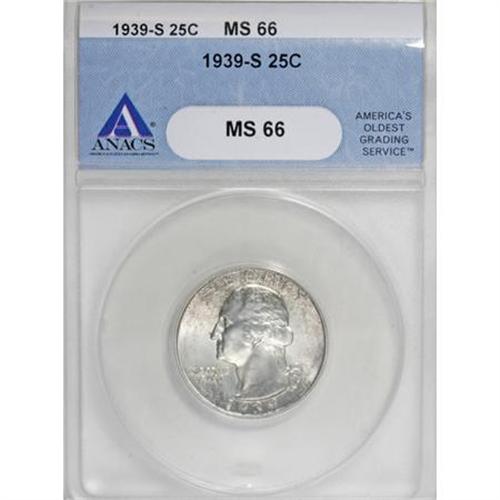 <B>1939-S 25C MS66 ANACS.</B></I> NGC Census: (204/30). PCGS Population (259/19). Mintage: 2,628,000. Numismedia Wsl. Price for NGC/PCGS coin in MS66: $350. (#5810)<BR><BR><B>Coin Engraver:</B> John Flanagan<BR><BR><b>Shipping:</b> Coins & Currency (<a target="_blank" href="http://www.heritageauctions.com/common/shipping.php">view shipping information</a>)