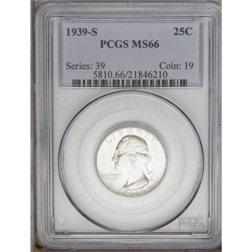 1939-S 25C MS66 PCGS. Dazzling luster is overlain with 1939-S[25C] MS66 PCGS.