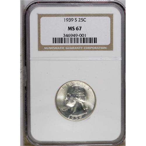<B>1939-S 25C MS67 NGC.</B></I> A hint of gold toning decorates this highly lustrous and splendidly preserved Superb Gem. Well struck save for minor softness throughout the obverse border. A popular low-mintage date that is nearly unobtainable any finer. A small mark on Washington's neck may well prevent an even higher grade. Census: 27 in 67, 0 finer (11/06).<BR><BR><b>Shipping:</b> Coin/Currency (<a target="_blank" href="http://www.heritageauctions.com/common/shipping.php">view shipping information</a>)