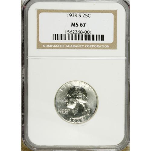<B>1939-S 25C MS67 NGC.</B></I> A truly superb S-mint that is enlivened with bright luster and is emboldened with a sharp strike. Immaculately preserved surfaces are untoned. Census: 28 in 67, 0 finer (12/06).<BR><BR><b>Shipping:</b> Coins & Currency (<a target="_blank" href="http://www.heritageauctions.com/common/shipping.php">view shipping information</a>)