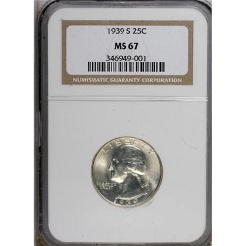 <B>1939-S 25C MS67 NGC.</B></I> A hint of golden toning decorates this highly lustrous and splendidly preserved Superb Gem. Well struck save for minor softness on the obverse border. A great example of this popular low-mintage issue. Neither NGC nor PCGS has graded a numerically finer piece (8/07).<BR><BR><B>Coin Engraver:</B> John Flanagan<BR><BR><b>Shipping:</b> Coins & Currency (<a target="_blank" href="http://www.heritageauctions.com/common/shipping.php">view shipping information</a>)