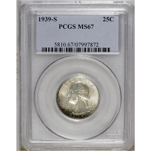 <B>1939-S 25C MS67 PCGS.</B></I> A challenging early mintmarked date in MS67, not perhaps so well recognized as semi-keys like the 1935-S, 1936-D, and 1938-S, but nonetheless quite elusive in Superb Gem condition. Both obverse and reverse appear essentially mark-free on this astonishing piece, which offers brilliant surfaces with an obverse rim tinged by russet, jade, and magenta. Among the finest at either service. Population: 87 in 67, 0 finer (10/06).<BR><BR><b>Shipping:</b> Coin/Currency (<a target="_blank" href="http://www.heritageauctions.com/common/shipping.php">view shipping information</a>)