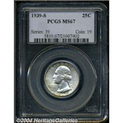 <B>1939-S<25C> MS67 PCGS.</B></I> This Superb Gem is tied for the finest certified by PCGS. Nearly full brilliance with satiny lustre and faint traces of color at the lower obverse and reverse. We have only handled similar PCGS certified examples of this issue a couple times in the past. An extremely important opportunity for the specialist. Population: 9 in 67, 0 finer (3/04). <BR><BR><B>Important notice:</B> Heritage usually auctions material at the rate of 200-250 lots per hour. On some occasions eBay Live bid software or the Internet may not be able to keep up with the pace of the auction. We recommend placing a realistic absentee bid now as insurance to avoid disappointment. Occasionally the auctioneer may eliminate or reject an eBay Live bid, and the auctioneer may also reopen a lot after the close of the eBay live bidding (usually because we missed an audience bid), and may reject your bid even if it shows you as the winning bidder. By bidding via eBay Live, you agree that Heritage may award the lot to another bidder at its sole discretion under the circumstances described above or any other reasonable circumstances. Since eBay bids are not shown to us until we open the lot on the floor, we treat those bids just like floor bids. In most cases the floor responds before the eBay bid is presented to us, due to Internet lag time, so for consistency we have made it a policy that floor bids are always considered first over tie eBay live bids. Also please note that all Heritage lots purchased through eBay Live carry a 20% Buyer's Premium. Please make sure you read the Terms and Conditions before you bid. </span></font></tr></table></td></tr></table>