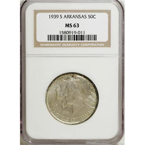 <B>1939-S 50C Arkansas MS63 NGC.</B></I> NGC Census: (44/362). PCGS Population (116/478). Mintage: 2,105. Numismedia Wsl. Price for NGC/PCGS coin in MS63: $308. (#9251)<BR><BR><b>Shipping:</b> Coins & Currency (<a target="_blank" href="http://www.heritageauctions.com/common/shipping.php">view shipping information</a>\)