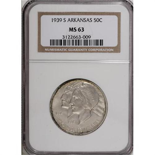 <B>1939-S 50C Arkansas MS63 NGC.</B></I> . NGC Census: (46/362). PCGS Population (116/486). Mintage: 2,105. Numismedia Wsl. Price for NGC/PCGS coin in MS63: $308. (#9251)<BR><BR><b>Shipping:</b> Coins & Currency (<a target="_blank" href="http://www.heritageauctions.com/common/shipping.php">view shipping information</a>)