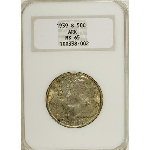 <B>1939-S 50C Arkansas MS65 NGC.</B></I> The speckled golden-gray and crimson patina that graces each side is deeper on the obverse. The clean surfaces of this Gem are especially desirable on this often-scuffed low-mintage issue.<BR><BR><b>Shipping:</b> Coins & Currency (<a target="_blank" href="http://www.heritageauctions.com/common/shipping.php">view shipping information</a>)