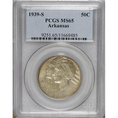 <B>1939-S 50C Arkansas MS65 PCGS.</B></I> A satiny Gem with medium olive, sky-blue, and caramel-gold toning. Well struck, and the reverse is splendidly preserved. Among the lowest mintage commemorative issues.<BR><BR><b>Shipping:</b> Coins & Currency (<a target="_blank" href="http://www.heritageauctions.com/common/shipping.php">view shipping information</a>)