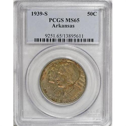 <B>1939-S 50C Arkansas MS65 PCGS.</B></I> The 1939 Philadelphia Arkansas from the DuVall collection is sold under lot 10085. The 1939-D Arkansas from the DuVall collection is sold under lot 10130. PCGS Population (189/77). NGC Census: (156/44). Mintage: 2,105. Numismedia Wsl. Price for NGC/PCGS coin in MS65: $825. (#9251)<BR><I>From The Frank DuVall Collection of U.S. Commemoratives.</B></I><BR><BR><b>Shipping:</b> Coins & Currency (<a target="_blank" href="http://www.heritageauctions.com/common/shipping.php">view shipping information</a>)