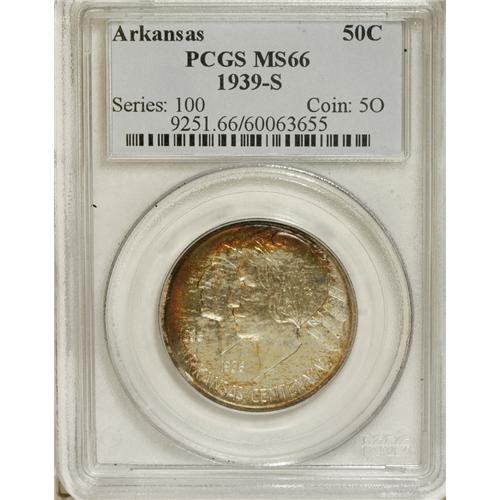 <B>1939-S 50C Arkansas MS66 PCGS.</B></I> A thin obverse crescent of ocher, magenta, and sage greets the viewer of this low-mintage issue in a long-running series. Population: 73 in 66, 4 finer (4/07).<BR><I>From The Cary & Cheryl Porter Collection.</B></I><BR><BR><b>Shipping:</b> Coins & Currency (<a target="_blank" href="http://www.heritageauctions.com/common/shipping.php">view shipping information</a>)