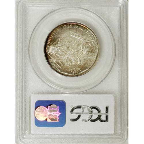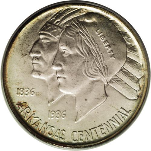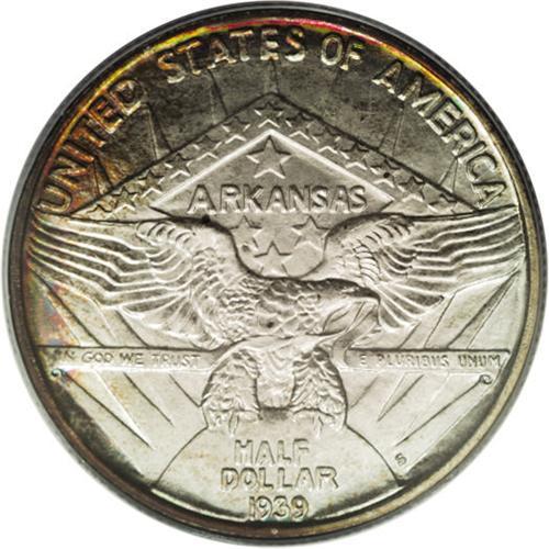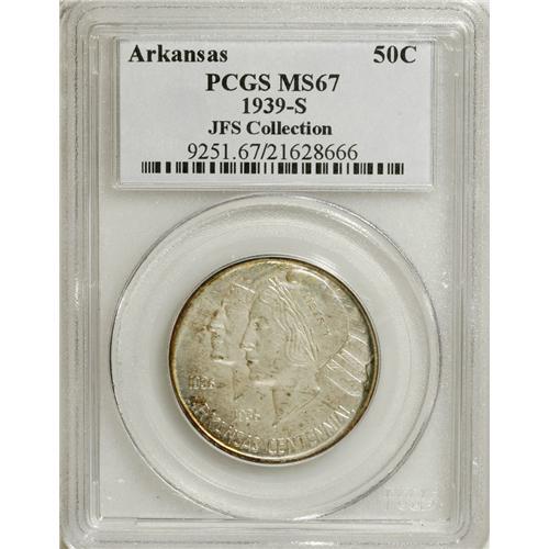 <B>1939-S 50C Arkansas MS67 PCGS.</B></I> Ex: JFS Collection. A band of ruby-red, navy-blue, and gold patina hugs the upper left reverse, although the undisturbed surfaces are mostly cream-gray with occasional freckles of tan patina. The popularity of silver commemoratives crested in the mid-1930s, and by 1939, the speculative fever had largely abated. Still, Congress had had enough, and the Act of August 5, 1939 sealed the door on the classic commemorative series until 1946. Only 2,100 PDS sets were issued, along with a few stray pieces destined for assay. One of just four Superb Gems graded by PCGS, with none finer (3/07).<BR><I>From The Cary & Cheryl Porter Collection.</B></I><BR><BR><b>Shipping:</b> Coins & Currency (<a target="_blank" href="http://www.heritageauctions.com/common/shipping.php">view shipping information</a>)