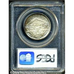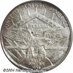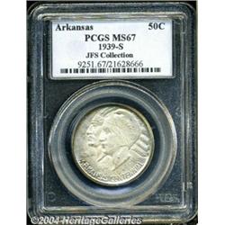 <B>1939-S<50C> Arkansas MS67 PCGS.</B></I> A band of ruby-red, navy-blue, and gold patina hugs the upper left reverse, although the undisturbed surfaces are mostly cream-gray in color with occasional freckles of tan patina. The final year of the Arkansas type. The popularity of Silver Commemoratives crested in the mid-1930s, and by 1939 the speculative fever had largely abated. Only 2,100 PDS sets were issued, along with a few stray pieces destined for assay. Among that small production, only a handful of survivors can match the exceptional preservation and strike of the present Superb Gem. Population: 4 in 67, none finer (6/04).<BR><I>Ex: New York Signature Sale (Heritage, 7/02), as part of lot 5051, which realized $32,200.</B></I><BR><I>From the JFS Collection, the #1 All-Time PCGS Registry Set.</B></I> <BR><BR><B>Important notice:</B> Heritage usually auctions material at the rate of 200-250 lots per hour. On some occasions eBay Live bid software or the Internet may not be able to keep up with the pace of the auction. We recommend placing a realistic absentee bid now as insurance to avoid disappointment. Occasionally the auctioneer may eliminate or reject an eBay Live bid, and the auctioneer may also reopen a lot after the close of the eBay live bidding (usually because we missed an audience bid), and may reject your bid even if it shows you as the winning bidder. By bidding via eBay Live, you agree that Heritage may award the lot to another bidder at its sole discretion under the circumstances described above or any other reasonable circumstances. Since eBay bids are not shown to us until we open the lot on the floor, we treat those bids just like floor bids. In most cases the floor responds before the eBay bid is presented to us, due to Internet lag time, so for consistency we have made it a policy that floor bids are always considered first over tie eBay live bids. Also please note that all Heritage lots purchased through eBay Live carry a 20% Buyer's Premium. Please make sure you read the Terms and Conditions before you bid. </span></font></tr></table></td></tr></table>