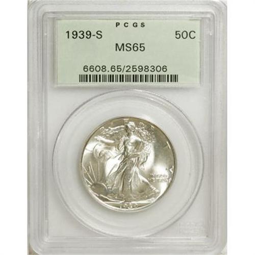 <B>1939-S 50C MS65 PCGS.</B></I> PCGS Population (1189/894). NGC Census: (646/523). Mintage: 2,552,000. Numismedia Wsl. Price for NGC/PCGS coin in MS65: $300. (#6608)<BR><BR><B>Coin Engraver:</B> Adolph A. Weinman<BR><BR><b>Shipping:</b> Coins & Currency (<a target="_blank" href="http://www.heritageauctions.com/common/shipping.php">view shipping information</a>\)