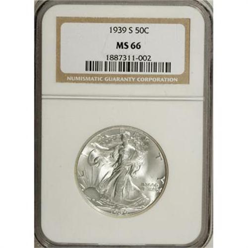 <B>1939-S 50C MS66 NGC.</B></I> NGC Census: (458/71). PCGS Population (809/91). Mintage: 2,552,000. Numismedia Wsl. Price for NGC/PCGS coin in MS66: $525. (#6608)<BR><BR><B>Coin Engraver:</B> Adolph A. Weinman<BR><BR><b>Shipping:</b> Coins & Currency (<a target="_blank" href="http://www.heritageauctions.com/common/shipping.php">view shipping information</a>)