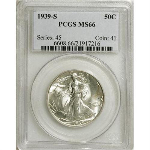 <B>1939-S 50C MS66 PCGS.</B></I> PCGS Population (796/86). NGC Census: (442/70). Mintage: 2,552,000. Numismedia Wsl. Price for NGC/PCGS coin in MS66: $585. (#6608)<BR><BR><b>Shipping:</b> Coins & Currency (<a target="_blank" href="http://www.heritageauctions.com/common/shipping.php">view shipping information</a>)