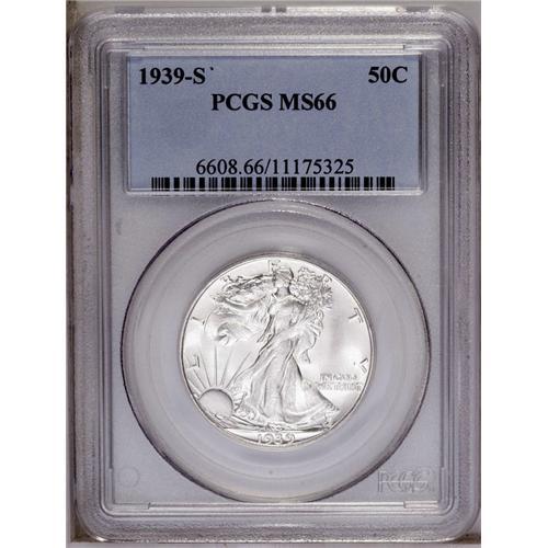 <B>1939-S<50C> MS66 PCGS.</B></I> The fields of this snow-white premium Gem are nearly unimprovable and the luster jumps when rotated under a light. Several light marks are noted on the central highpoints and prevent the Superb Gem level. <BR><BR><B>Important notice:</B> Heritage usually auctions material at the rate of 200-250 lots per hour. On some occasions eBay Live bid software or the Internet may not be able to keep up with the pace of the auction. We recommend placing a realistic absentee bid now as insurance to avoid disappointment. Occasionally the auctioneer may eliminate or reject an eBay Live bid, and the auctioneer may also reopen a lot after the close of the eBay live bidding (usually because we missed an audience bid), and may reject your bid even if it shows you as the winning bidder. By bidding via eBay Live, you agree that Heritage may award the lot to another bidder at its sole discretion under the circumstances described above or any other reasonable circumstances. Since eBay bids are not shown to us until we open the lot on the floor, we treat those bids just like floor bids. In most cases the floor responds before the eBay bid is presented to us, due to Internet lag time, so for consistency we have made it a policy that floor bids are always considered first over tie eBay live bids. Also please note that all Heritage lots purchased through eBay Live carry a 20% Buyer's Premium. Please make sure you read the Terms and Conditions before you bid. This lot is being auctioned in conjunction with a live floor auction by Heritage Galleries & Auctioneers. All final auction and invoice information will be supplied by Heritage Galleries & Auctioneers, and all other information should be considered preliminary. Lot:2981 <BR><BR><B>Winning Notification and Billing:</B> After the FINAL session in this auction is complete, Heritage will send e-mail and snail mail invoices. This process normally takes several days. All final auction and invoice information will be supplied by Heritage Galleries & Auctioneers, and all other information should be considered preliminary. <BR><BR>This auction will be conducted on a live auction floor and over the Internet through eBay Live. If you choose to place an absentee bid, please take a moment to <font color='#0000ff'><u><a href='http://pages.ebay.com/liveauctions/help/before/laabsentee.html'>learn how eBay Live absentee bidding works</a></u></font><font color='#000000'>
