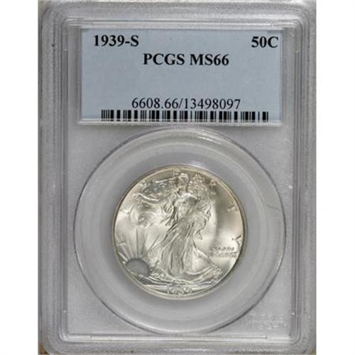 <B>1939-S 50C MS66 PCGS.</B></I> PCGS Population (807/91). NGC Census: (455/71). Mintage: 2,552,000. Numismedia Wsl. Price for NGC/PCGS coin in MS66: $525. (#6608)<BR><BR><B>Coin Engraver:</B> Adolph A. Weinman<BR><BR><b>Shipping:</b> Coins & Currency (<a target="_blank" href="http://www.heritageauctions.com/common/shipping.php">view shipping information</a>)