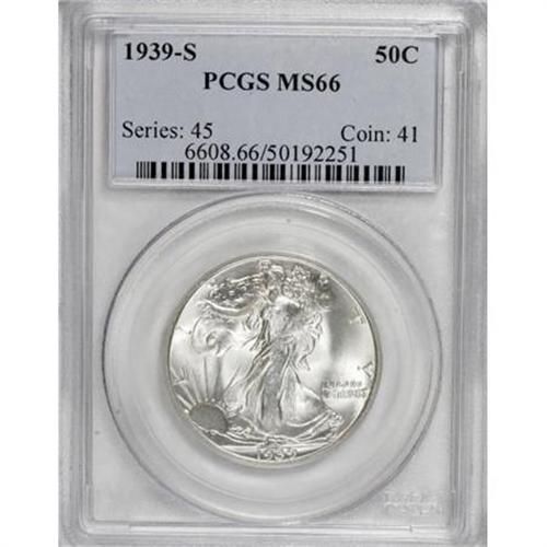 <B>1939-S 50C MS66 PCGS.</B></I> PCGS Population (809/91). NGC Census: (458/71). Mintage: 2,552,000. Numismedia Wsl. Price for NGC/PCGS coin in MS66: $525. (#6608)<BR><BR><B>Coin Engraver:</B> Adolph A. Weinman<BR><BR><b>Shipping:</b> Coins & Currency (<a target="_blank" href="http://www.heritageauctions.com/common/shipping.php">view shipping information</a>)
