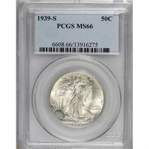 <B>1939-S 50C MS66 PCGS.</B></I> PCGS Population (814/91). NGC Census: (458/71). Mintage: 2,552,000. Numismedia Wsl. Price for NGC/PCGS coin in MS66: $525. (#6608)<BR><BR><B>Coin Engraver:</B> Adolph A. Weinman<BR><BR><b>Shipping:</b> Coins & Currency (<a target="_blank" href="http://www.heritageauctions.com/common/shipping.php">view shipping information</a>)